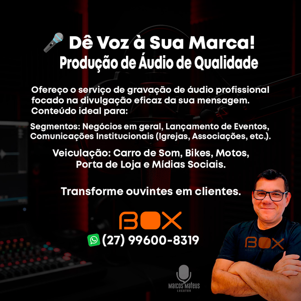 Faço sua gravação para divulgação em carro de som/bike, porta de loja, spots e offs para vídeos institucionais. Aumente o fluxo de clientes no seu negócio; ANUNCIE!