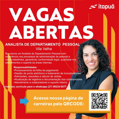 Se você tem experiência com Folha de Pagamento, Admissão e Demissão e mora próximo à região de Vila Velha, envie seu currículo para o número abaixo