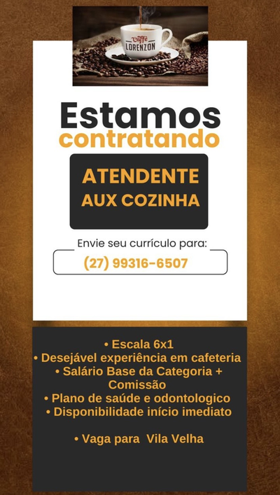 Estamos contratando Auxiliar de Cozinha e Atendente, com ou sem experiência. Procuramos alguém comprometido, ágil e com vontade de aprender.