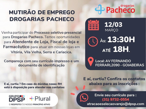 Venha participar do Processo seletivo presencial para Drogarias Pacheco. Temos oportunidades para Atendente de Loja, Fiscal de loja e