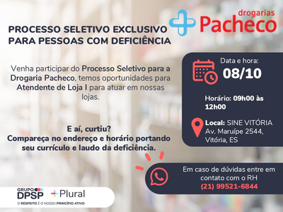 PROCESSO SELETIVO EXCLUSIVO PARA PESSOAS COM DEFICIÊNCIA - DROGARIAS PACHECO - ESPÍRITO SANTO