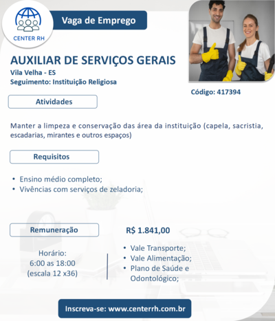 INSTITUIÇÃO RELIGIOSA CONTRATA PROFISSIONAL DE LIMPEZA.