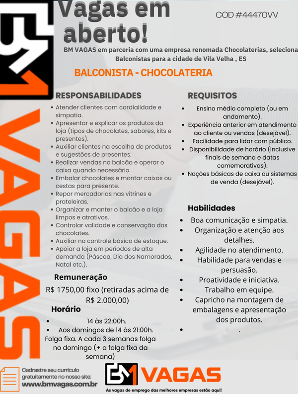 Desejável Experiência comprovada (mínimo de 6 meses) em vendas ou atendimento ao cliente em ambientes de varejo especializado, preferencialmente no setor de alimentos gourmet ou confeitaria.