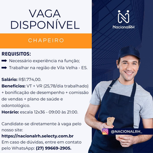 Benefícios: VT + VR (25,78/dia trabalhado) + bonificação de desempenho + comissão de vendas + plano de saúde e odontológico.