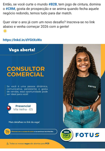 Então, se você curte o mundo #B2B, tem jogo de cintura, domina o #CRM, gosta de prospecção e se anima quando fecha aquele negócio redondo, temos tudo para dar match.