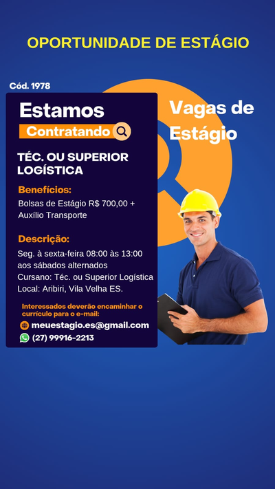 Benefícios: Bolsas de Estágio R$ 700,00 + Auxílio Transporte