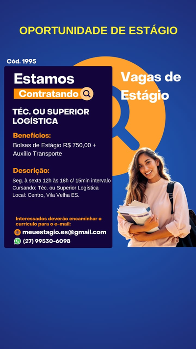 Benefícios: Bolsas de Estágio R$ 750,00 + Auxílio Transporte