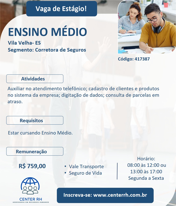 Remuneração: R$ 759,00 + Vale-Transporte + Seguro de Vida.