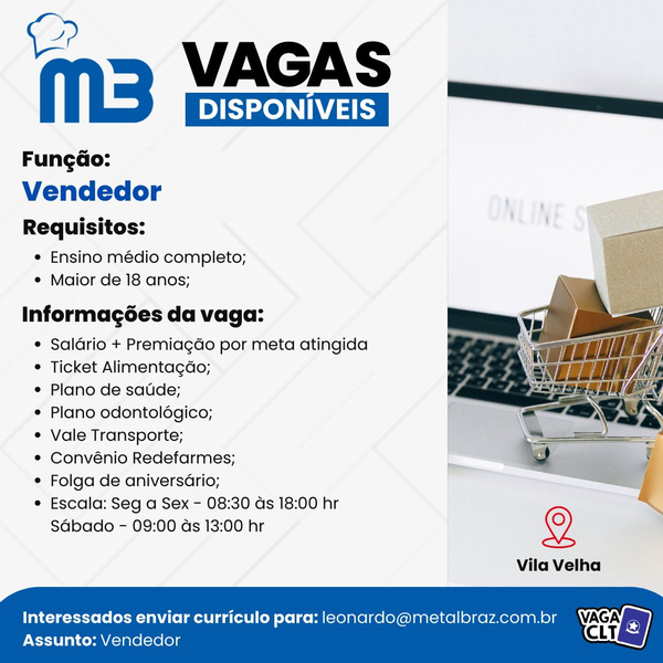 A vaga é presencial no centro de vila velha, com contratação CLT.