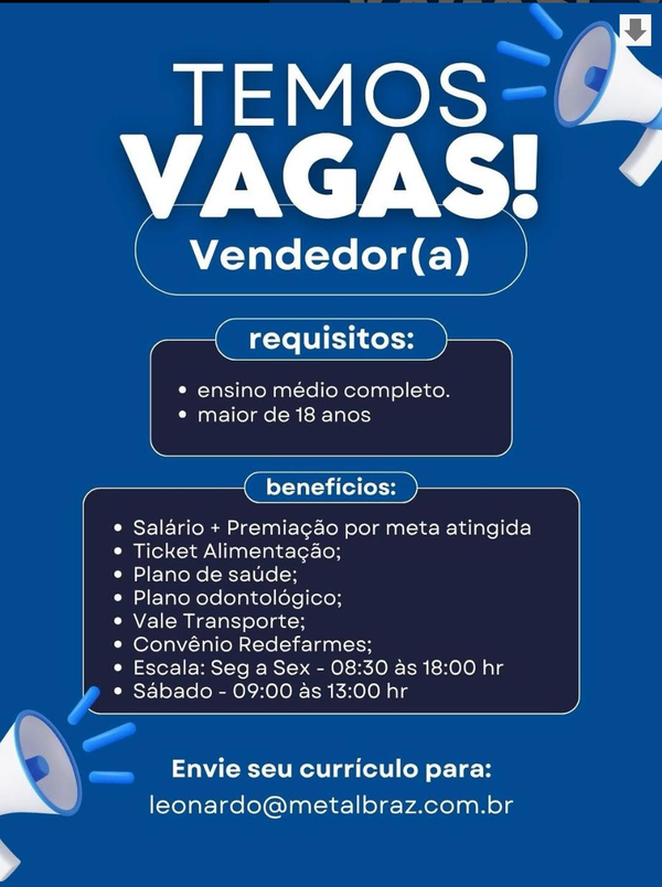 Estamos a procura de um(a) vendedor(a) para fazer parte da nossa equipe. As informações estão na foto acima e se você tem interesse, basta enviar o seu currículo para o nosso e-mail.