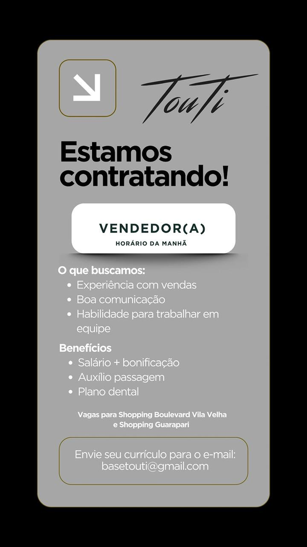 A Touti Boulevard, esta contratando vendedoras. Iniciou imediato.